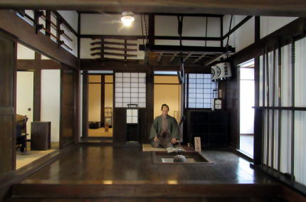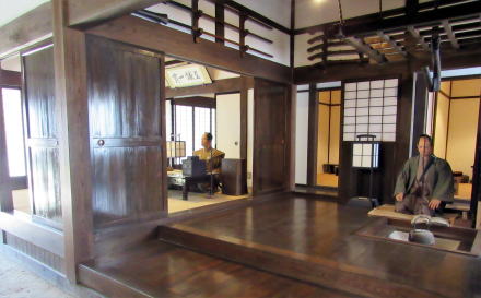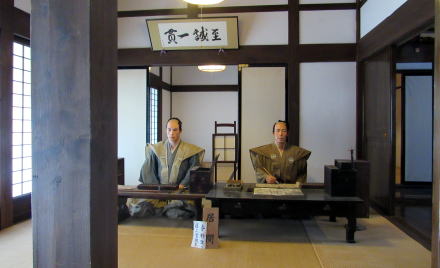番所陣屋の土間から見ると、左側に取り調べ(検問)役の藩役人とその脇に書き役(書記)がいる部屋があって、取り調べ役が質問したり、手形の提示を求め、書き役が帳簿に手形改めや荷物検査の結果を記録しました。 |