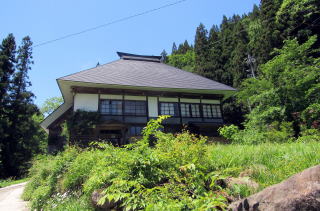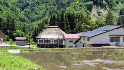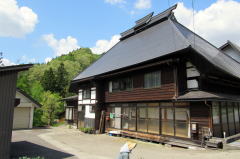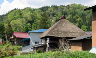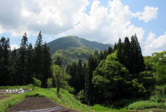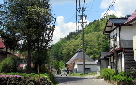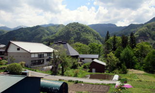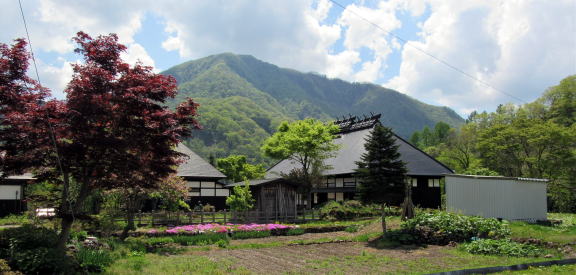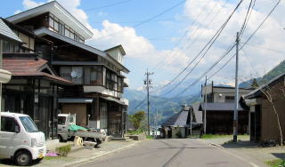 集落の東側には岩戸山などの尾根が迫っていますが、それらは姫川の深い峡谷の対岸に並んでいる山並みです。