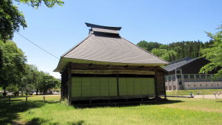源長寺を出て街道に戻り、さらに南に歩くと、小さな沢の先に社殿群が見えてきます。千国の諏訪神社です。