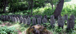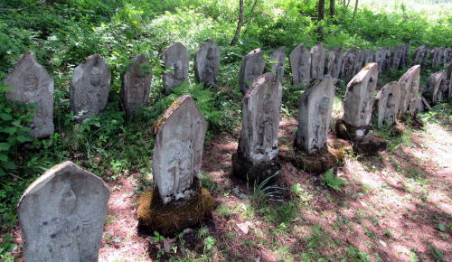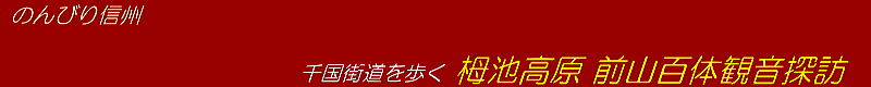 この森陰の小径の南西端に前山百体観音と呼ばれる石仏群があります。山裾に石仏群が並んでいます。江戸時代には、まさに鬱蒼とした森の真ん中にあったのでしょう。今は前山の西側は切り開かれ、栂池高原スキー場の東の端にあって、西に草原斜面が開けた場所です。