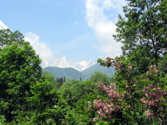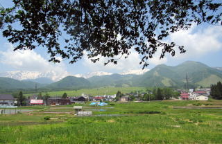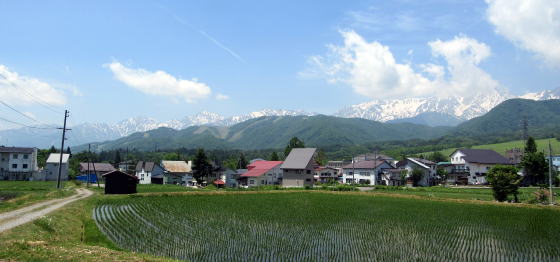 私は左側には深い森の冷気を感じ、右側から初夏の木漏れ日を浴びながら、そして栂池高原の背景に白馬連峰の残雪を眺めながら、快適な遊歩を続けました。