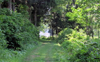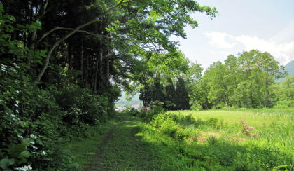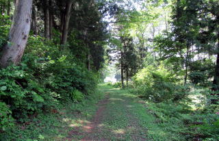 塩の道は、牛方宿を過ぎて舗装道路から左に分かれて山裾の森のなかに入っていきます。前山の鬱蒼たる森の北の端を南西に向かって歩きます。