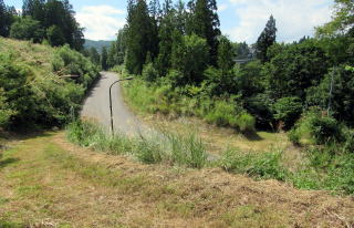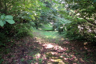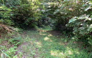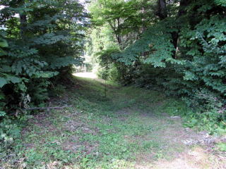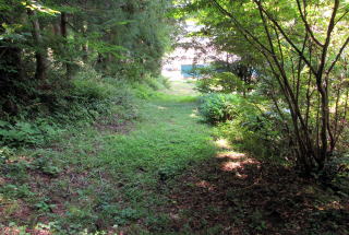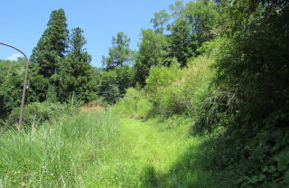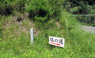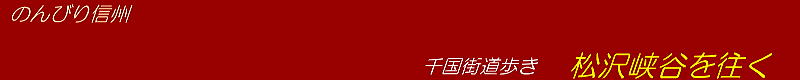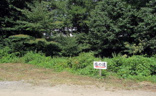 古い塩の道はスキー場集落を南に流れ下る沢(松沢の支流)に沿って谷を降りていくようです。松沢峡谷に向かって下っていく、この塩の道は、草に覆われた幅1.5メートルほどの小径です。この小径は、栂池パノラマ端に連絡する舗装道路をU字カーヴを描いて横切った後、林のなかを下り、やがて旅館松沢荘の脇に出ます。そこで千国北城線に合流します。