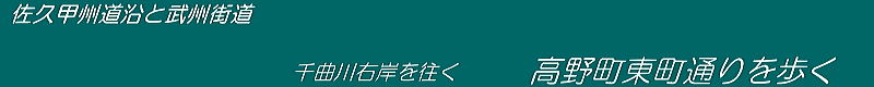 ![]() ▲海瀬四ツ谷の旧街道沿いの家並み ![]() ▲敷地が広く豪壮な主屋や土蔵、長屋門が目を引く ![]() ▲旧街道は抜井川の谷間に降りていく ![]() ▲醤油醸造業の重厚な工房兼店舗古民家 ![]() ▲醤油醸造蔵の脇の草地は寺院の跡地か ![]() ▲江戸時代の四ツ谷の辻はこのT字路ではないだろうか ここまで武州道は抜井川に沿って谷間をやって来たらしい。今でも電柱の脇に石仏が置かれているが、それがが追分(分岐点)の見印だったようだ。 ![]() ▲ここから街道沿いに高野町東町の繁華な商店街があった ![]() ▲シャッターが閉まったままの店舗跡も目立つ ![]() ▲東町交差点: 映画館の跡地は東町公会場になった ![]() ▲入沢の広壮な屋敷は亜土時代の村役人宅か ![]() ▲六地蔵幢と呼ばれる石仏群が並ぶ街道脇 |
