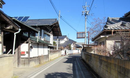 ◆旧武州道沿いの家並み◆ 今回の旅では、武州道が千曲川右岸の道に出合う海瀬四ツ谷の辻を出発点にしようと考えたのですが、その辻がどこだかわかりません。目立つような遺構や痕跡が見つからないのです。そこで、国道462号の四ツ谷交差点から北に歩くことにしました。