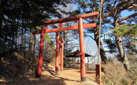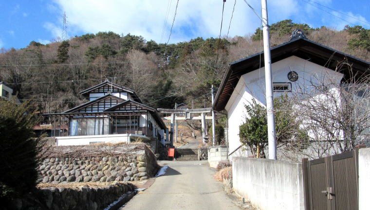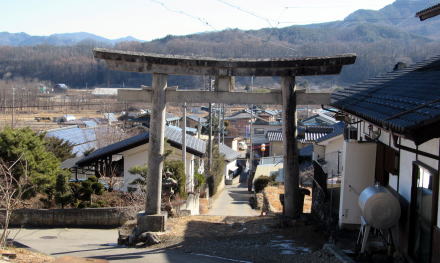 さて、大門地区には山裾の斜面を東から西にのぼる参道のような小径が通っています。佐久甲州道との辻から西の尾根を見上げると、段丘崖のとば口に石の大鳥居が建てられています。「産土神」という扁額が掲げられています。昭和末期から平成期にかけての建立のようです。