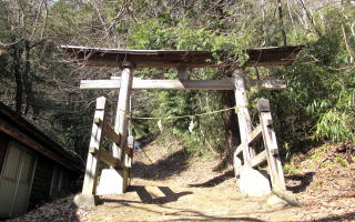 ![]() 旧街道から大門地区の背後の尾根の上り口に「産土神」という扁額を掲げた大鳥居がある |