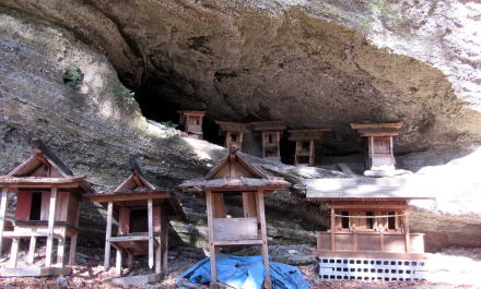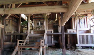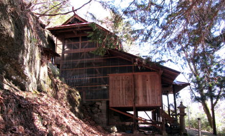 諏訪社の社殿は切り立った岩壁(断崖)の下の岩棚にあるのですが、その隣、南西側の岩壁の下に窟屋のような窪みがあって、そこには古びた祠が数多く集められています――祭神名も記されず雑然と並んでいます。明治末期の祠堂合祀令によって上畑集落内に分散して祀られていた小さな社や祠をここに合祀したと見られます。 |