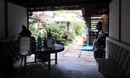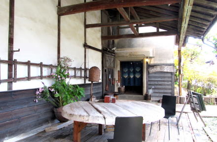 ▲古民具ともいえる道具が並ぶ長屋門をくぐり抜ける