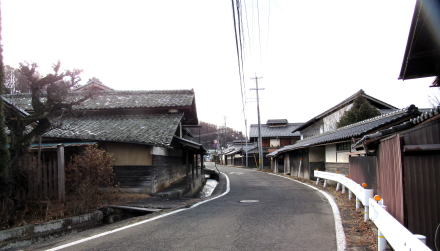 ▲黒澤酒造の建物群(左側)の脇を往く旧街道