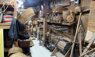 盥や手桶、生糸紬用の糸繰車輪が雑然と並ぶ