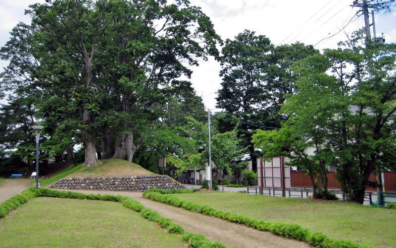 野沢城跡(城山公園)となっているのは城館の主郭跡で、横80メートル、縦110メートルほどの長方形で、土塁跡が保存され、堀跡と見られる水路がめぐらされています。大伴神社の脇には土塁跡に連結した土壇があります。幅が半分以下に削られたように見えます。ここには、楼台または見張り櫓があったものと見られます。