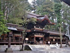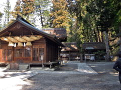巨大な神楽殿と幣拝殿によって連結された2つの片拝殿が並ぶ構造は、諏訪大社様式という独自の神殿建築だ。 |