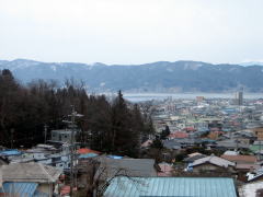 盆地の縁に位置する下諏訪の街。斜面に街並みがへばりついている。