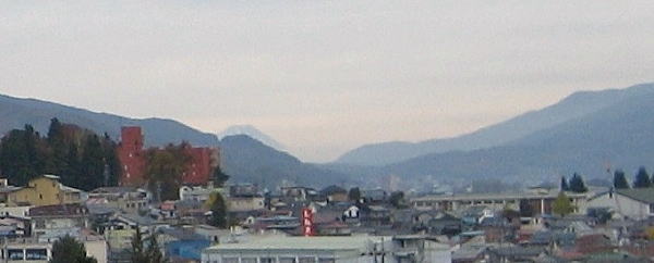 和田峠への往還となる旧中山道沿いでも諏訪湖越しに富士山を展望できるポイントがいくつかある。そのひとつが、諏訪大社下社春宮の東側を下る旧中山道の坂道だ。慈雲寺界隈からの国道142号沿いの高台からも富士山を展望できる。
