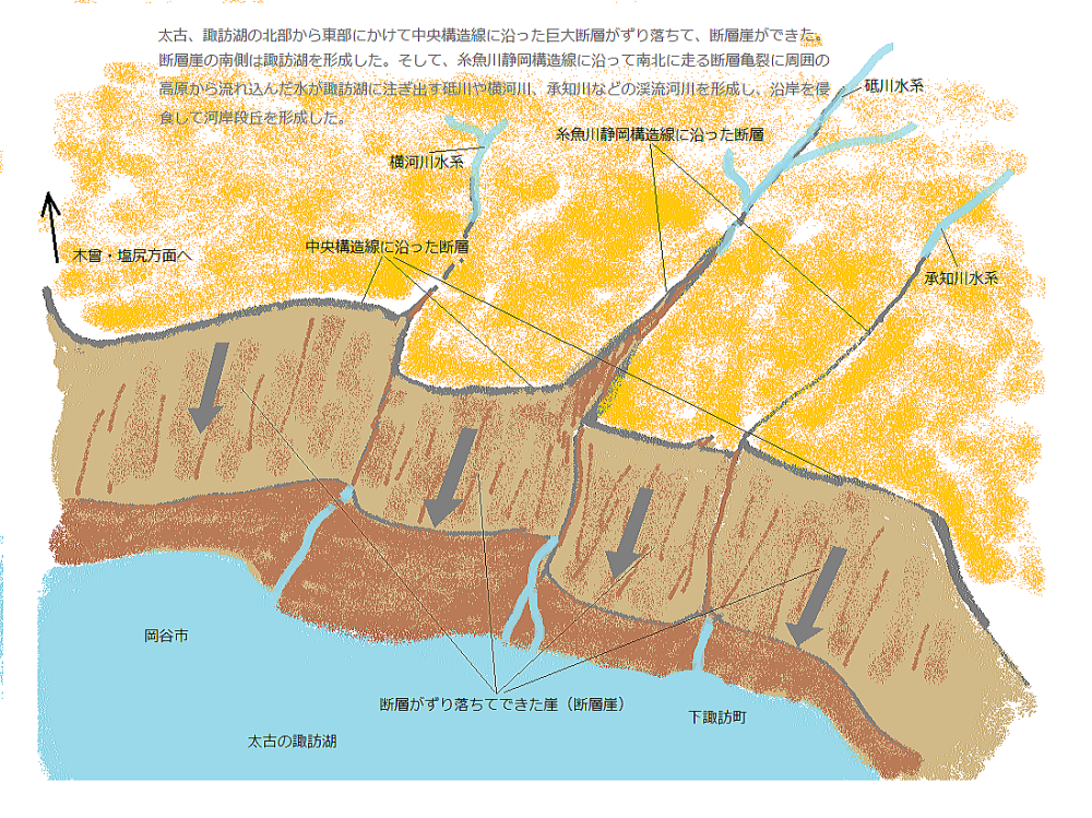 上掲の絵図は、太古に諏訪湖北岸から北東岸の一帯が、巨大断層に沿って南側にずり落ちて、高低差100メートルに近い断層崖をつくり出したときの地形変動を想像したものです。