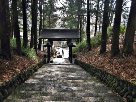 旧中山道を南に向かい、諏訪大社下社春宮の脇で南東方向に曲がってから200メートルほどで「竜の口」の石段にいたります。