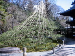 冬には雪吊りの縄で保護