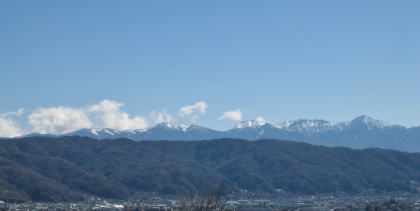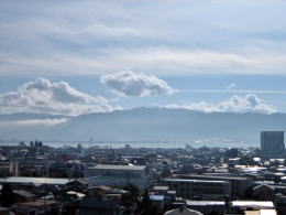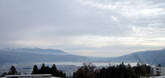 塩尻峠から岡谷と諏訪湖を俯瞰する。南東方面には冠雪の八ヶ岳連峰が見える。右手の山腹越しに富士の山頂部がかすかに見える。湖の彼方の左右に八ヶ岳と富士の秀峰が展望できる下諏訪は、いかにも神の座としてふさわしい。⇒富士の山影拡大写真