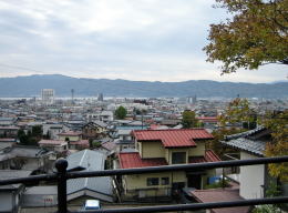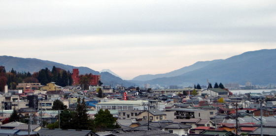 春宮の鬱蒼とした鎮守の森の脇の長い坂を下り左に曲がると、湖畔の都市風景が目に入ってきます。
