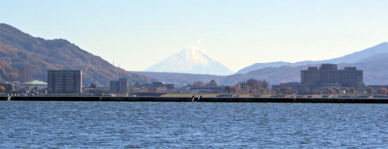 快晴の日には諏訪湖の上に富士山の山頂部と稜線を眺めることもできます。その方向は湖の東端近く、上諏訪方面の山並みの谷間で、諏訪大社下社秋宮の右上方です。