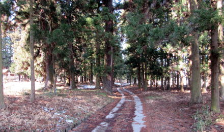 ▲安曽社の杉社叢のなかを通る鎌倉道跡は轍の左側にあるか