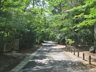 参道の両側を囲む桜やケヤキ、松などは、葉がびっしり茂った枝を伸ばして、参道に上に覆いかぶさって涼しい日陰をつくっています。