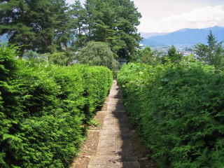 龍光院の参道はヒバの垣根に縁取られた細い石畳の坂道です。