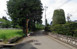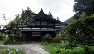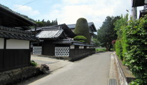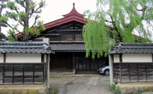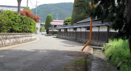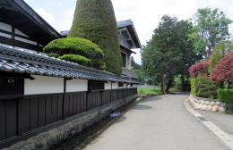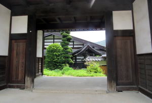 立派な薬医門が横の前庭に向いている。幕藩体制下では、家の造りや門の構えについては家格に応じて各藩の許可が必要だった。明治以降にはそういう統制がなくなったので、この塩尻地方では、裕福な住民が薬医門や長屋門を――古い慣習に遠慮してか――敷地内に道路に面しない形で建造する風習ができたと推察される。 |