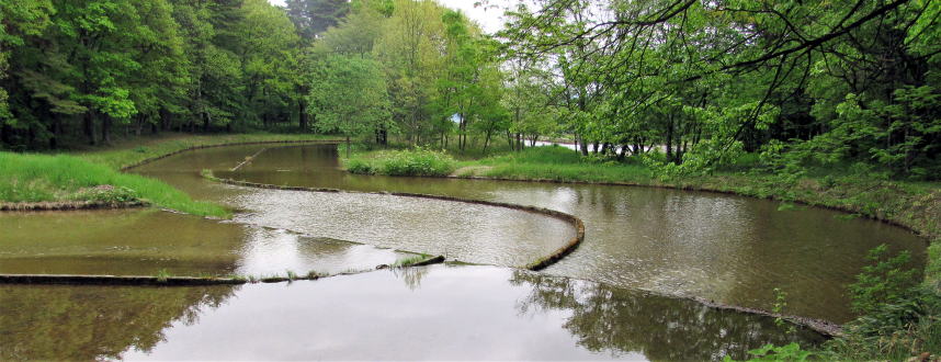 ▲大町市上原わっぱらの温水路「ぬるめ」 幅広で浅い水深で蛇行する水路