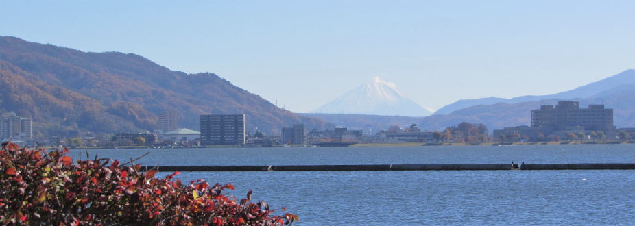 ▲下諏訪町みすべ公園から対岸、上諏訪方面の眺望 街並みの上に富士山
