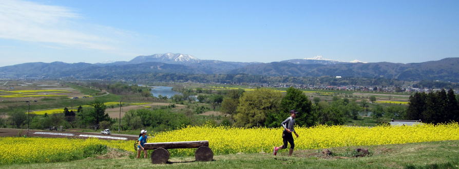 ▲飯山市千曲川東岸の菜の花公園 菜の花の丘の下を流れる千曲川: 背景は斑尾山、妙高連峰
