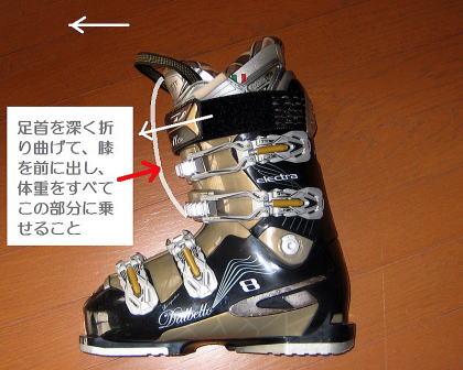 プルークボーゲン Pflugbogen とはドイツ語で「犂で波形を描くこと」という意味です。つまり、両スキーでV字型をつくって雪面を滑り降りながら波形にターンしていく、という技術です。 実際に滑って練習する前に、スキー靴のはき方と靴への力のかけ方――体重のかけ方――を説明しておきます。 まず靴は足のサイズにぴったりと合わせて選んでください。靴のなかに緩みがあると、力が靴やスキー板にしっかり伝わりません。 スキー靴を装着するときには、身体を前に倒すか、膝を思い切り前に出して、向こう脛に全体重をかけるつもりで、踵の後ろに隙間がないようにしてください。 雪斜面を滑るときには、つねにスキー板のバランス中心に重心を置いておくようにするのですが、そのためには、膝の向こう脛で靴を抑え込むような気持で、向こう脛にすべての体重をかけるようにします。そして、足の母指球から土踏まずを結ぶ線に加圧します。 ふくらはぎ側(後ろ側)に体重がかかっていると、雪上で身体が不安定になり、しかもスキーのエッジに加重できなくなります。 つまり、エッジングが甘くなり、ターン弧の正確さ(切れ味が)なくなります。 |