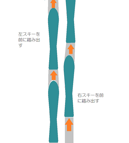 平行ステップ歩行パラレル parallel とは、英語で「並行」という意味ですが、スキーでは両スキーを平行に開くことを意味します。斜度のない平滑な雪面で、両スキーを肩幅ほどに平行に開いてください。そして、左か右かどちらかのスキーを膝を軽く持ち上げて歩くように前に踏み出します。このとき、後方に残り軸となる足・スキーをしっかり踏みつけて推進力を生みだすとともに、踏み出す膝の動きに先行して両肩と頭、ストックと上体を前に押し出します。そして、これを繰り返して前方に移動します。 肩や上体が脚とスキーの動きに遅れないように、むしろ先行するように意識します。ストックは慣れないうちは動かさなくてもいいでしょう。 この動作を平行(パラレル)ステップ歩行と呼びます。 |