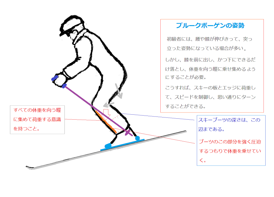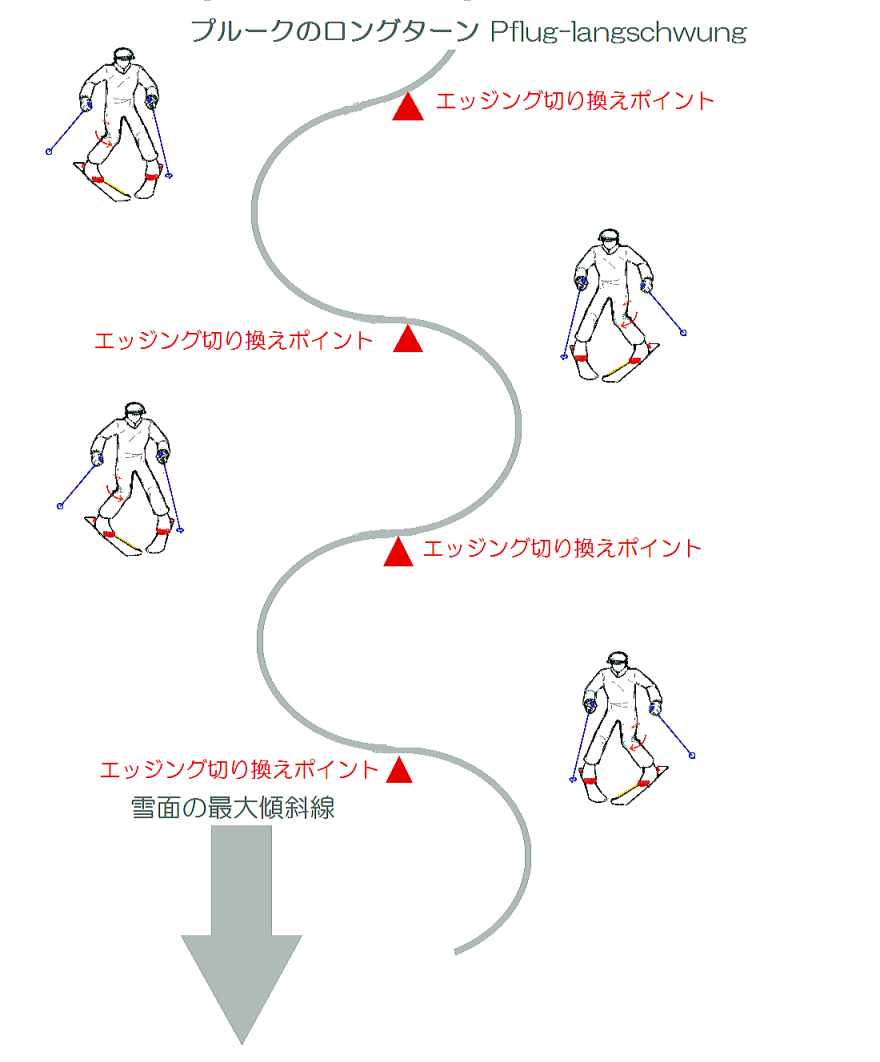 緩斜面でのプルークボーゲンのターン初級者のプルークボーゲンの練習は、斜度10°くらいの整地された雪面でおこないます。緩斜面でプルークボーゲンの静止姿勢を取るためには、両スキーのインサイドエッジをより深く雪面に突き立てる(押し込む)ようにします。エッジの食い込みが甘いと、ズルズル滑り出してしまいます。 滑り出すためには、このエッジングの加圧を緩めます。ある程度加速してからでないと、ターン動作ができません。滑り出しは斜めの方がいいでしょう。 斜めに滑り出してから、ターン動作に入ります。そのターン弧の外側になるスキーのインサイドエッジに加圧します。 まず左ターンに入るためには、右スキーのインサイドエッジに加圧します。右ひざを内側に回し込みながら、右足の内側、つまり母指球から土踏まずにかけての部分に強く加圧します。 このとき、左スキーでは、足裏全体に荷重しながらも軽くインサイドエッジに加圧して、バランスを保つ支えとすることで安定を保つようにします。 このとき、肩はあまり回さないようにすることがポイントです。肩や腰を回してターンに持っていくのではなく、肩や腰はあまり回さずに、腰から下、とくに膝の回し込みと足裏での加圧によってターンを導くようにします。 その場合のターンの横幅(振幅)は、最初のうちは10メートルくらいにします。そして、振り幅を広くしたり狭くしたりしながら、さまざまな弧の大きさのターンを試してみましょう。 この場合、重心は腰の中心辺りにあるのですが、それをスキーの中心に置いたままで移動させません。重心の位置は変えずに、左右スキーエッジへの加圧の交互に変えることで、ターンをおこないます。 そのさい肩を大きく回すと、次のターンに入る前に肩を戻さなければならなくなって、そうしているあいだにスキーは滑り続け、加速してしまいます。つまり、次のターン動作への切換え動作が遅れてしまううえに、加速して不安定になります。 重心を移したりすると、これまた重心位置を戻すために時間を取ることになり、加速しすぎたり、不安定になったりしてしまうのです。 肩と顔の向きは、ターンの後半では次のターン弧の中心を見つめるようにして、次のターン動作への準備姿勢を取ることになります。 肩は回さず、重心も移さず、ターンは膝の回し込みとエッジングの切換えで! というのが鉄則です。 初学初級者は、スピードにあまり慣れていないので、ターン時のエッジングで速度がかなり落ちてから反対向きの次のターン動作に入るのがよいでしょう。しかし、速度・推進力がまたく失われるとターン動作に入ることができません。 プルークボーゲンのターンに習熟し慣れるにしたがって、ターンの切換えのタイミングを速くしていきましょう。 そして、雪面の斜度を少しずつ上げていきましょう。 普通は、滑走速度を高めると、横振れ幅(振幅)に対するターンの縦の長さ(周期・降下高低差)の比率が大きくなります。それだけ、重力加速度(斜面を滑り落ちる力)が大きくなるということです。 こうしてみると、プルークボーゲンでは、同じ斜度の雪面で滑る場合、横振れ幅を大きくすると滑走速度は小さくなり、縦の長さを大きくすると速度は大きくなるという関係があるわけです。 |