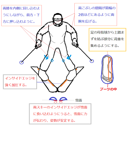 ![]() 両ストックは姿勢を支えるアンカーのように使うこと。ただし、ストック(腕の力)頼りすぎるのは誤り。ストックなしでこの姿勢を保てるようにすること。