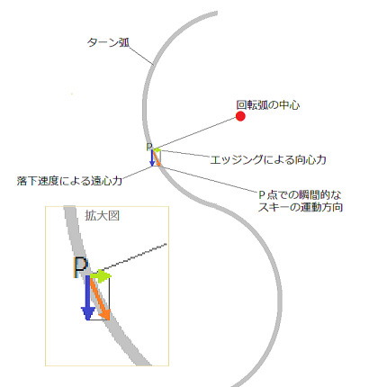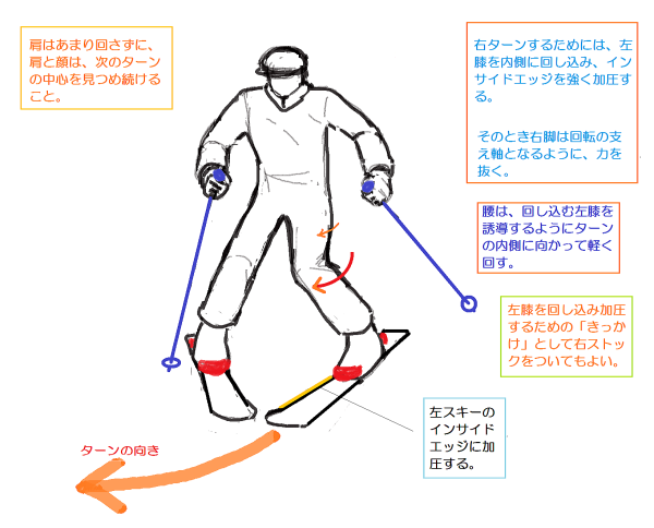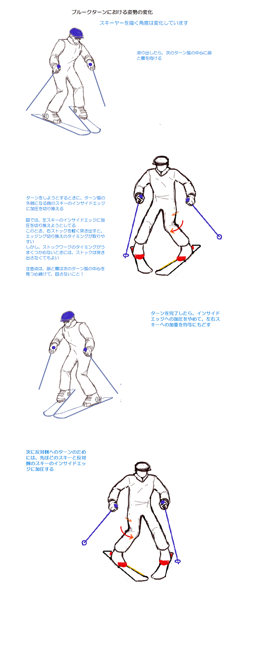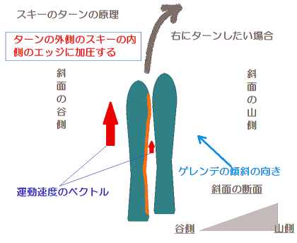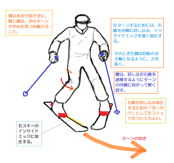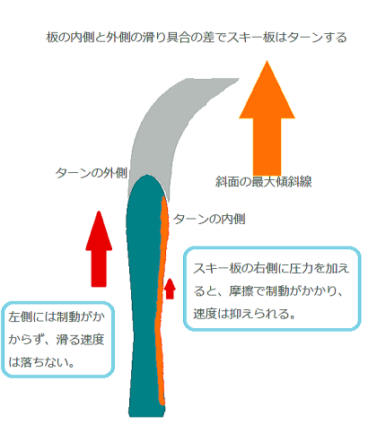 | エッジングによる摩擦でスキー板が回旋する ターンの内側のスキーと 外側のスキー 基本は、 外側スキーのインサイドエッジへの加圧 内側のスキーは支え |