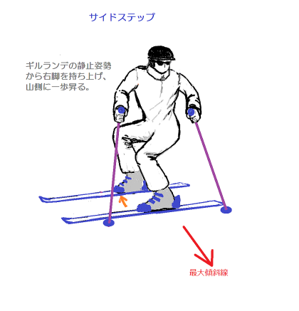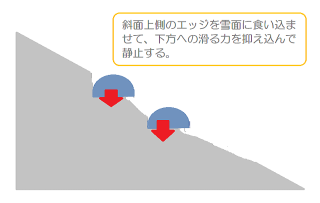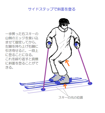 斜面を登るためには、両スキーを平行に保ったまま、山側スキーを斜面の上側に移動しエッジを雪面に食い込ませ、そのスキーを軸として、下のスキーを上に引き上げてエッジを雪面に食い込ませます。 |