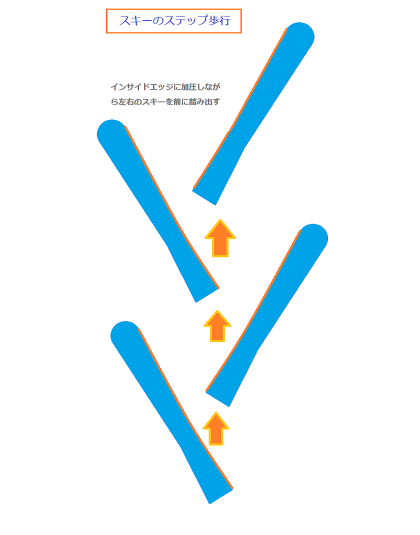 スキーのステップ歩行としては、ほかに前開きステップがあります。スケイトの加速のための踏み出しと脚・足の動きがよく似ているので、ステイティング・ステップともいいます。 |