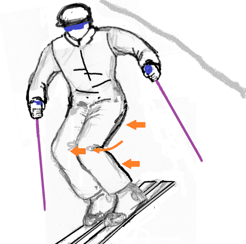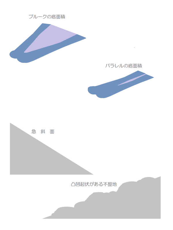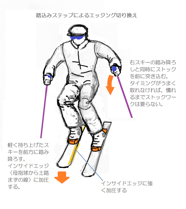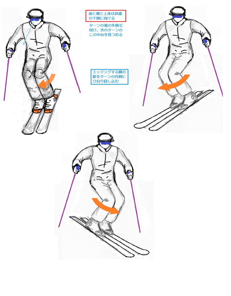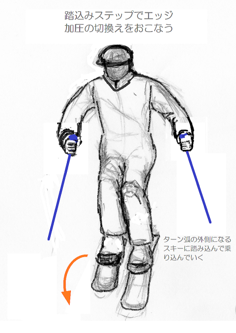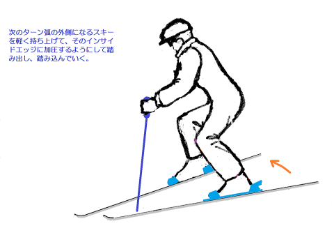 外向傾姿勢それではパラレルターンに進みましょう。パラレルとは平行という意味です。両スキーを平行開きまたは平行揃えにしてターンをおこなうことになります。ここではまず、両スキーを肩幅くらいの幅に平行に開くことから始めます。 すでにシュテムギルランデを習得したので、シュテムギルランデからパラレルギルランデに移行するという練習方法を取りましょう。完全なターンよりも浅いターンをする方が容易だからです。 シュテムターンでは、両スキーをV字型開きにすることで姿勢の安定を保ちましたが、パラレルでは平行開きで、接地面の幅をずっと狭くするために、より不安定になりやすいので、そこで姿勢の安定を保つ技能や体感が重要になります。そのための姿勢が外向傾なのです。外向傾姿勢が取れなければ、ここから先に進むことはできません。 プルークボーゲンの練習のところで、ターンのさいにはたらく様々な力について触れましたが、それをもう一度おさらいします。 ターンするためには、膝を前に突き出しながらターン弧の内側に回し込んで、外側スキーのインサイドエッジに加圧しますが、これによって弧の内側に動かそうとする力がはたらきます。同時に、雪斜面ですから最大傾斜線に沿って滑落しようとする、外側に向かう力もはたらきます。こうして、ターン弧上では、瞬間瞬間に弧の接線方向にスキーヤーが運動することになります。 外向傾とは、膝を屈曲させながら、腰を前に落とし、上体をやや前傾させ(前傾しすぎてはいけない!)ながら、回旋弧のやや外側(斜面の下方)に肩と顔を向ける姿勢です。 ターンのさいに肩を回していけない! 肩と顔は次のターン弧の中心を見つめろ! という鉄則は、このような諸力が作用する状況で姿勢を保つためのポイントです。 外向傾という姿勢は、外傾姿勢と向傾姿勢という2つの運動姿勢の合成によってつくられる形です。外傾というのは、遠心力のはたらく方向に傾く姿勢です。向傾というのは、斜面を真下に向かって落下する力に耐えるために、やや前傾になる姿勢です。これには、膝を深く曲げて前に押し出す、腰と上体をそれに遅れないように前に押し出し先行動作するという動きがともないます。 そして、膝を回転の内側方向に回し込んで、外スキーのインサイドエッジに加圧するという操作が、向心力を生み出します。 顔と肩を次のターン弧の中心に向け続けるというのは、つねに雪面状況に対応しながら次のターンのために準備姿勢(先行動作)を取るために不可欠の動きです。 これまでよりも不安定な状況でターンを繰り返していくためには、外向傾姿勢は欠かせません。あらゆる斜面状況で外向傾を保つ、これが上級者となるための最大のポイントです。 踏込みステップ結局のところ、次のターン弧の外側になるスキーのインサイドエッジに加圧することが、ターンの要です。これには内側への膝の回し込み屈曲がともないますが。平行開きの姿勢で、外スキーへの加重・加圧の切換えを俊敏に正確におこなうことがポイントです。そのための動作、そしてイメイジトレーニングの形が、踏込みステップによる加重・加圧の切換えです。つまり、外スキーを軽く宙に持ち上げて、前に踏み込んでインサイドエッジに加圧していくということです。 このときの注意点は、外スキーを持ち上げるときに腰と上体が上に持ち上がってしまい、結果として、スキーの滑走速度に対して腰が後ろに遅れてしまうこと、つまり後傾になって、体重が後ろに残ることにならないように、肩と顔、腰を先行動作させて軽く前に押し出すようにすることです。 そうならないための方法として、持ち上げた外スキーのトップが下を向いているようにするということがあります。上を向いていたら、後傾になっている証拠です。 両ストックを前方に押し出すと姿勢の回復ができます。そして、踏み降ろすスキーと反対側のストックを踏み降ろしと同時に前方に突き込みます。 以上のポイントを押さえたうえでパラレルギルランデの練習をおこなってください。そして、完全なターンを繰り返す連続的なパラレルターンに進んでください。 斜度の緩い整地斜面での練習から始めてだんだん斜度をきつくしていき、さらにクラスターや小さな起伏があるやや荒れた斜面での滑走に慣れていくのがいいでしょう。なお、この段階では平滑な新雪斜面での滑りはまだまだ困難です。それについては、1級以上の応用技術として解説します。 とはいえ、私自身の経験からしても、シュテムギルランデやパラレルターンでははじめのうちは、どうしても後傾姿勢になってしまいがちです。姿勢のバランス感覚は何度も繰り返して慣れて習熟していくしかありません。しかし、上記のポイントを理解するかしないかで、天地ほどの差が生まれます。 両スキーを平行にそろえる理由左図は、シュテムターンとパラレルターンのシュプール(雪面痕跡)の違いを示したもので
