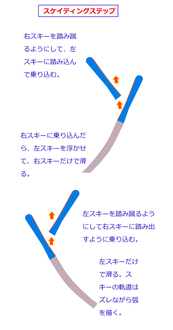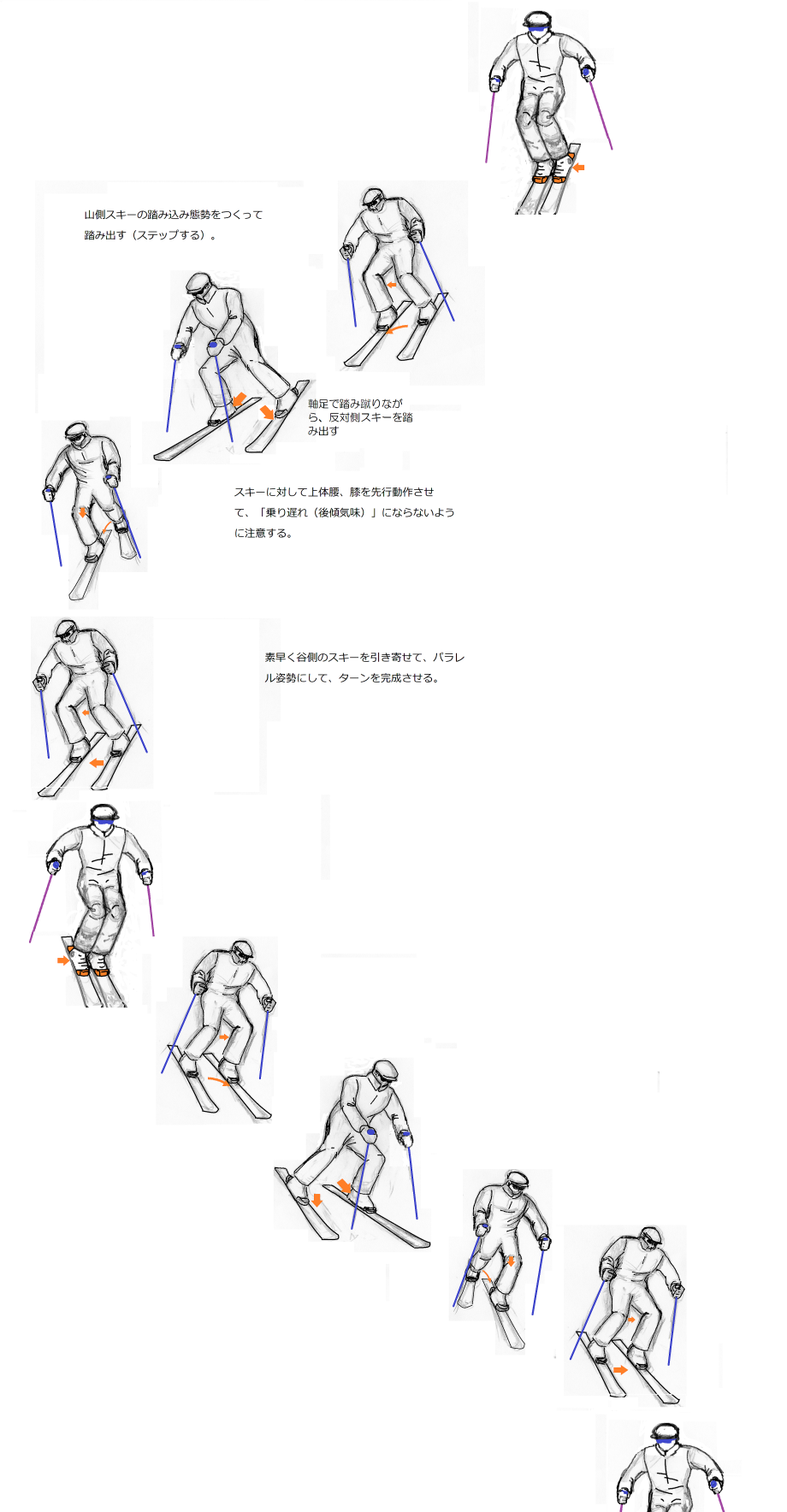 スケイティングステップ前編の初級のステップ歩行の項で前開きステップ歩行(スケイティング・ステップを学びましたが、ここではそれをもっと能動的に速い滑走移動方法として学びます。そこで「スケイティングステップ」と「・」を入れない名称とします。これはノルディックスキーの最も主要な走法のひとつです。 水平な雪原で繰り返して練習してください。面白くない滑りですが、上級者になるための体力やバランス感覚を磨くための方法だと割り切ってください。 ステップターンは、このスケイティングステップをターンに取り入れて、アグレッシヴなパラレルターン(ロングターンやミドルターン)をおこなうためのテクニックです。 能動的な乗り込みでステップターンパラレルターンの踏み換えのときに、次のターンの外スキーに飛び込むように能動的にステップしていくということです。そのさいに、反対側のスキーを踏み込みのための軸足として使います。つまり、踏み蹴りながら、インサイドエッジに加圧するように、外スキーに乗り込んでいくということになります。乗り遅れないように、重心を思い切って移すことがポイントになります。その瞬間には姿勢が不安定になりがちですから、バランス感覚も研ぎ澄ます必要があります。 通常の歩行や走りと同じように、踏み出す脚の反対側の腕を前に突き出してストックを突きます。このとき、両腕(ストック)を前に突き出すことで、上体を前に動かして、後ろ重心や後傾にならないようにするのもいいでしょう。 踏み込んだ後体重を移動させて乗り込んでしまったら、反対側のスキーを素早く引き寄せてパラレル姿勢を迅速に回復させます。 だいたい、このステップターンくらいまでが、現在のSAJ検定1級合格までのカリキュラムではないかと思います。1級は中級の卒業、上級への入学試験(入り口)とも言えるものです。 したがって、ここから先は、1級レヴェルを越えて、本当の上級者になっていく訓練です。1級を取得してからも学ぶべきことは山ほどあります。 おそらく現在でも1級の受験資格として検定2級合格(2級保持)が条件となっていると思います。2級から受験することになります。検定を申し込むと午前中は受験科目・内容の講習をおこなうはずです。午後が試験です。 少し費用はかかりますが、2級または1級受験希望ということで、スキー学校の講習を受けてみるといいでしょう。自分の弱点が把握でき、検定までに補強することができます。 ![]() |