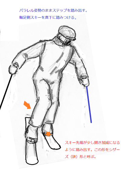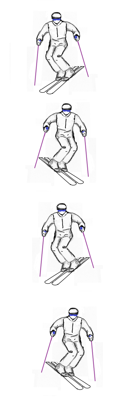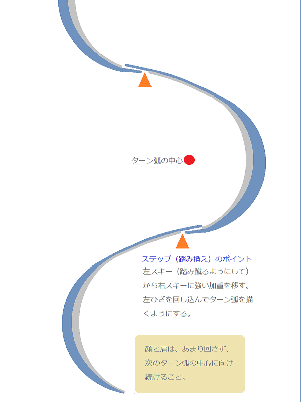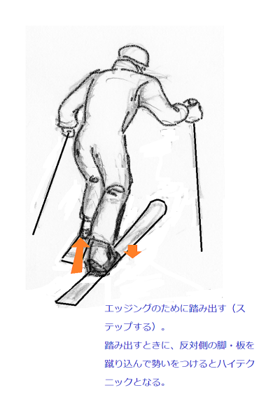 踏み換え交互操作のウェーデルン交互操作によるウェーデルンでは、左へのターンの場合には素早く右スキーのインサイドエッジに踏み込んでターンをおこない(そのさい左スキーはわずかに浮かす)、次いで左スキーのインサイドエッジに踏み込んで反対向きのターンをおこない(そのさい右スキーはわずかに浮かす)、このあとこの交互操作を繰り返します。スキー場での練習も大切ですが、左図の交互操作によるエッジングの切換え動作を、室内で(ストックやブーツなしで)素早く繰り返す運動をおこなって、身体運動とタイミングのイメイジをトレイニングしましょう。 タイミングの取り方をイメイジしながらストックワークの仕方を習得します。踏み換えステップで左足が床に突くのと同じタイミングで右ストックを突く、右足が床に突くのと同じタイミングで左ストックを突く、というタイミングを習得しましょう。 そのイメイジを強く頭に焼付けてから雪面ゲレンデで練習します。イメイジトレイニングなしでいきなり雪面に出ても、おそらく上達は見込めません。というのも、雪面での運動は室内よりもはるかに難しいので、まして室内でのイメイジトレイニングなしで雪面練習しては成功するはずもないのです。 この方法を習得すると、1秒に1回のターンまではいくことができるはずです。しかし、普通の人はそれ以上に速くターンすることはできないでしょう。そこで次の段階に進みます。 なお、踏み換えステップの高度な応用技術がすてステップターンです。これは、後で学ぶことになります。 |
