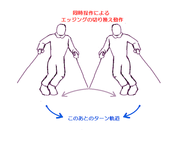 同時操作のウェーデルンの難しさは、両スキーをそろえて同時にエッジングの切換えをおこなうことです。指導員クラスでも、「同時操作のウェーデルンをやってみなさい」と言われてすぐできた人は100人に1人もいないのではないでしょうか。 意地悪な言い方ですが、この段階では、交互操作のウェーデルンを何千回も練習すれば、やがてできるようになるはずです、としか言いようがありません。 |