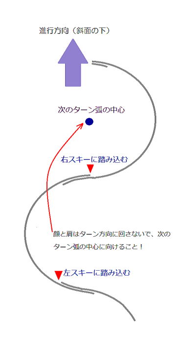 小回りの連続ターンそれではウェーデルンに進みましょう。ドイツ語の「クルツシュヴング」とは「短いターン」という意味です。ドイツ語綴りの英語発音のウェーデルンは、振幅が小刻みの揺れや振動という意味です。 このサイトでは、プルークボーゲンからプルーク姿勢のままでターンの切換えを速くするという練習法でウェーデルンにアプローチすることを解説しました。これがウェーデルン習得へのひとつ目の方法です。 練習用の雪面として、斜度15~20°くらいの整地された斜面を選び、滑り出しはプルークウェーデルンから始めて、しだいに両スキーの幅を狭めて平行にしていき、パラレル姿勢に変えていくというやり方がおススメです。 さらに、この直前に学んだパラレルターンができるようになったら、ターン切換えのタイミングを速くしていくという方法でウェーデルンを習得する道もあります。これがふたつ目の方法です。 では、どれくらいにターンの切換えのタイミングは速くなればウェーデルンと呼べるのか? という疑問が出るでしょう。ここでは、コブ斜面・オフピステででのウェーデルンの習熟という目標からして、2秒に1回以上のターン滑走をウェーデルンと呼ぶことにします。 左図は、1秒に1回以上のタイミングでターンを繰り返すウェーデルンを想定したものです。 左右の振り幅が4メートル、半径が2メートルのターンだとすると、滑走速度はおよそ44キロメートルほどになります。このくらいの切換えタイミングのウェーデルンだと、左図のようにスキーヤーの顔と肩はほぼずっと真下を見たままで、腰から下、とくに膝から下のひねり込みで回旋していることがわかります。 1秒に1回以上の切換えのウェーデルンでは、顔や肩を回すことはできません。回すと姿勢を戻すために時間がかかり、切換えタイミングはもっとずっと遅くなってしまうでしょう。 このようにそこそこ速いウェーデルンをするためには、相当に大きな落下速度も必要ですから、斜度は18~20°以上の急斜面となるでしょう。 エッジングでは不可避的にブレーキがかかるので、速度を保つためにはそれだけ重力加速度gが必要ですから、たとえば斜度φ°の斜面で直滑降した場合、滑り出してからt秒後の速度vは、 v=gtsinφ となります。 エッジによる摩擦制動率をλとすると、 v= (1-λ)gtsinφ となります。 このような関係式と経験から、ウェーデルンのターンのタイミングと斜度との関係を割り出すこともできます。 そして、ターン弧が正弦曲線または円弧の集合からなるものとすると、この関係式から微積分によって、真下への滑走速度は、√2分の1、およそ70%となることが導き出せます。上記のように、滑走時速44キロメートルでウェーデルンすると、真下方向への速度はおよそ時速31キロメートルほどになります。 これは最低限度の速さですから、ウェーデルンでは滑走速度は時速50キロメートル以上で真下への運動は時速35キロメートル以上にはなるはずです。これに耐える筋力や反射能力が必要ですから、ウェーデルンを習得するためには、日常の訓練が必要です。 ビルの10階までなら、エレヴェイターを使わず歩いて昇り降りするとか程度の運動は最低限度必要です。その歩き方も、肩や腰が膝よりも遅れないように歩くとか、膝の向こう脛を意識し、足裏の母指球から土踏まずの線に加重して歩くというような訓練を兼ねた歩行方法で。緩い坂でのダッシュもいいでしょう。 スキー場に暮らしているわけではない人がスキーを上達するためには、基礎体力とともに日頃の(体さばきの)イメイジトレイニングが大事です。 ウェーデルンのイメイジを示した左側のイラストは、いわば完成された姿です。 プルークターンまで習得したとしても、いきなりそういうウェーデルンにまで進むことは難しいでしょう。 そこで、段階的に技術を習得していきます。 まずはじめに、パラレルターンで学んだ踏み換えエッジングの交互操作のタイミングをどんどん速くしていって、3秒に1回くらいから2秒に1回、さらに1秒に1回くらいにまでもっていく方法を学びます。 |
