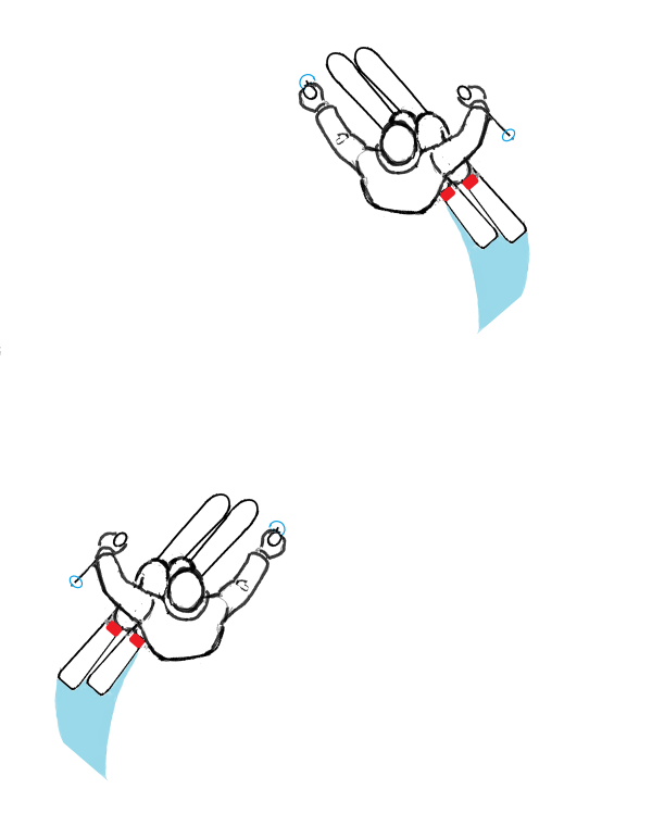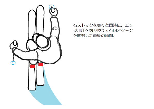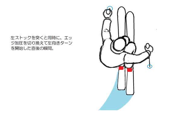 エッジング切換えのタイミングが速いターン![]() ターンの瞬間の身体の様子を真上から見ると・・・左ターン