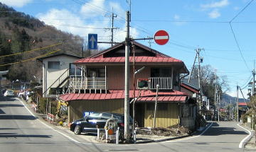 ▲以前、道祖神の横には赤いトタン葺の古民家があった