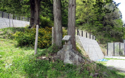 どちらも塚のてっぺんのサワラの根元に石祠が祀られています。道の近く、手前の方には祠の奥側に1対の小さな御柱が残っています。奥の祠の前には木製の鳥居が建てられています。いずれにも御柱があったのですが、6本は倒されて保存されています。