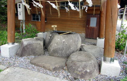 奥にはサワラを挟んで一対の石祠。水神社だろうか。