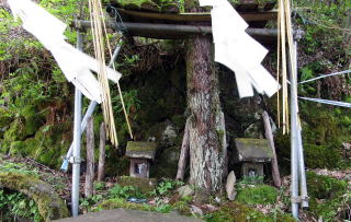 水場の奥にはサワラの木を挟んで1対の石祠が置かれています。ここが泉ならば、この祠は水神様でしょう。