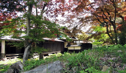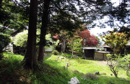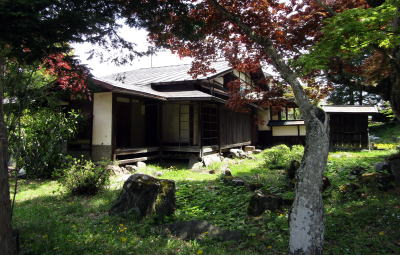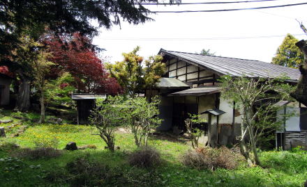 ▲古びた大棟造りの邸宅と荒れた庭園がある